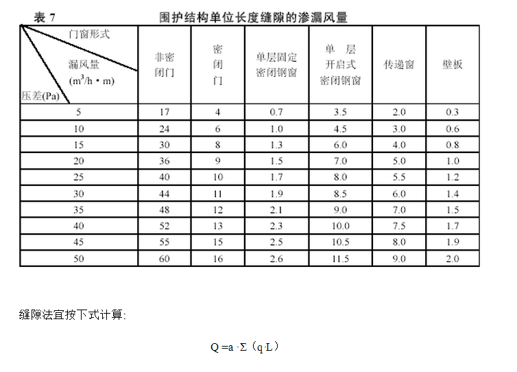 q—當潔凈室為某一壓差值時,其圍護結構單位長度縫隙的滲漏風量(m3/h·m);        L—圍護結構的縫隙長度(m)。     2 換氣次數法,宜按下列數據選用:   壓差 5Pa時,1~2h-1。     壓差 10Pa時,2~4h-1。